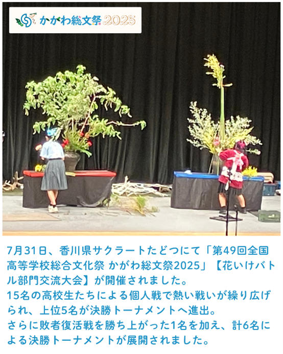 「第49回全国高等学校総合文化祭 かがわ総文祭2025」の花いけバトル部門交流大会が、7月31日に香川県で盛大に行われました!
