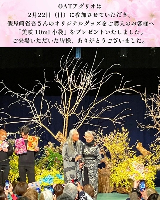 1月28日(日)から2月28日(土)までの開催期間の中、OATアグリオは2月22日(日)に参加させていただき、假屋崎省吾さんのオリジナルグッズをご購入いただいた皆さまへ「美咲10ml小袋」をプレゼントいたしました。